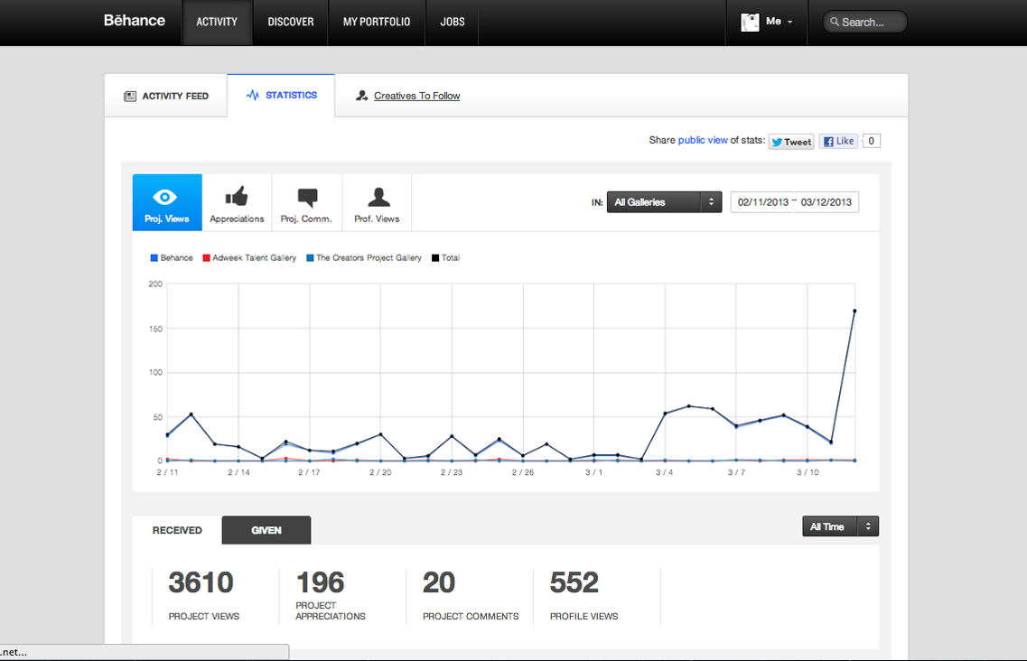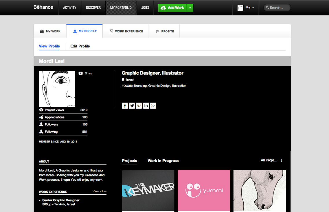 הפרופיל האישי שלכם. כאן תוכלו לצפות ולהזין את המידע האישי שלכם, ניסיון עבודה (קורות חיים) ועוד. מומלץ להשקיע כמה שיותר בכל הפרטים ולא לחפף. את הפרופיל תוכלו לעצב בעזרת ממשק קל ונוח לתפעול ולהתאים אותו לטעמכם, בנוסף תוכלו לעצב כל פרויקט שתעלו לתיק העבודות שלכם. בתיק העבודות אפשר להעלות עבודות שלמות או לחילופין, להעלות wip - Work In Progress. כאן תוכלו לשתף את העוקבים שלכם בכל תהליך היצירה ולא רק במוצר המוגמר. ניתן לעדכן גם דרך האפליקציה ישירות מהאייפון (כן, גם על האפליקציה נדבר בפוסט נפרד).